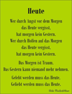 GeschreibselIn verschiedenen Lebensabschnitten und aus verschiedenen Anlässen - auch, um Dinge innerlich abzuarbeiten - habe ich Geschichten und Gedichte geschrieben und tue es immer mal wieder.Da gibt es Nachdenkliches, Humorvolles, Grundsätzliches und auch Nachrichten an ander - oft ganz bestimmte - Menschen.Ich habe nichts dagegen, wenn Texte von mir (mit Verfasser-Hinweis) für private Zwecke verwendet werden, möchte jedoch darüber informiert werden.Andere Verwendung meiner Texte bedarf einer vorherigen schriftlichen Genehmigung durch mich.